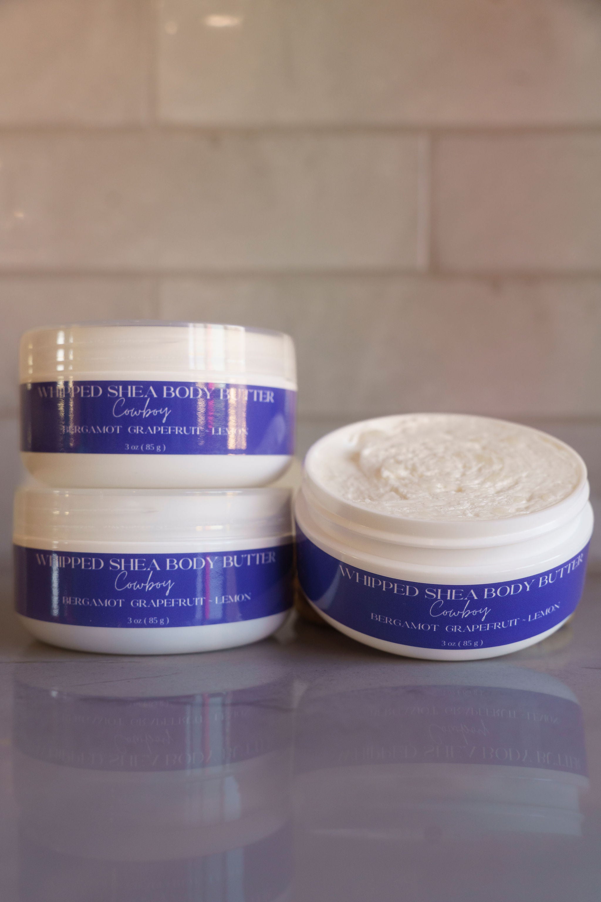 Each body butter arrives in a natural frosted jar with a safety seal lid and label.